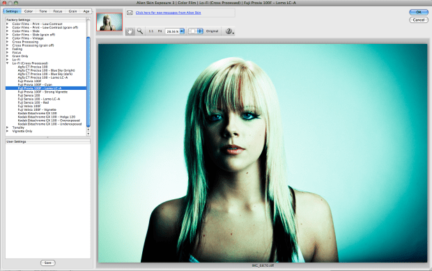 The picture above of the lovely Kristine was processed in the Color Film interface of Exposure 3 using a cross processed Fuji Provia 100F / Lomo LC-A filter instantly transforming the image into a look that suited my intention for the final product.    Here is the same picture, it’s original as well as a cross section of a few different film filters (out of hundreds available) just for a little taste of how differently you can make one image look depending on your taste.