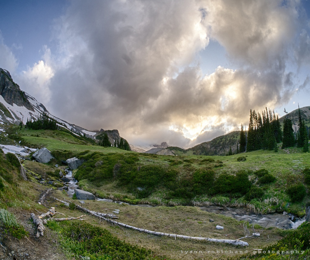 Panoramas can provide a powerful, visual recreation of any scene. Some may say to merely shoot with a wide angle, which is a nice way to get a sweeping view in, but it can alter the appearance of compression in relation to subject matter and of subjects in your frame and is often more susceptible to distortion (bowing lines, keystoning, etc). Many of my panos are shot using wide angle lenses for effect as well, so there is no fast, hard rule. One fun reason to shoot and stitch panoramas is to gain a wider angle at a more compressed perspective making it appear less distorted, or closer to a real life representation regarding perspective. Another is to have a huge file from which you can print large, beautiful high resolution prints. In the next part to this series, I’ll show you what I mean. For now, I’ll let you in on how I shoot my frames with the intent to stitch together a simple panorama later on in Photoshop (or Elements, or PanoStitch, or any free panorama stitching software). We could discuss multi pass layered panoramas, but for this one (and because this is how I shot on Rainier) we will keep it to a simple, single row panorama.