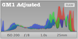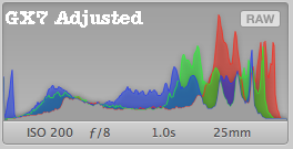 Below is the GX7’s adjusted histogram overlaid on top of the GM1’s adjusted histogram.  The peaks and valleys are similar, and both shots were captured and adjusted identically, but there are a few different values, primarily in the mid tones.  Not a huge difference, and not one that is particularly perceptible, but interesting to see the histograms nonetheless.