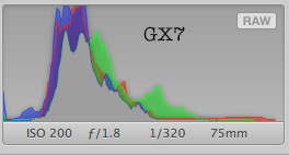 The GM1 has compacted the entire range to the left comparatively according to the unadjusted file’s histograms, and the green channel on the GX7 is obviously pushed further into the mid tone range comparatively.