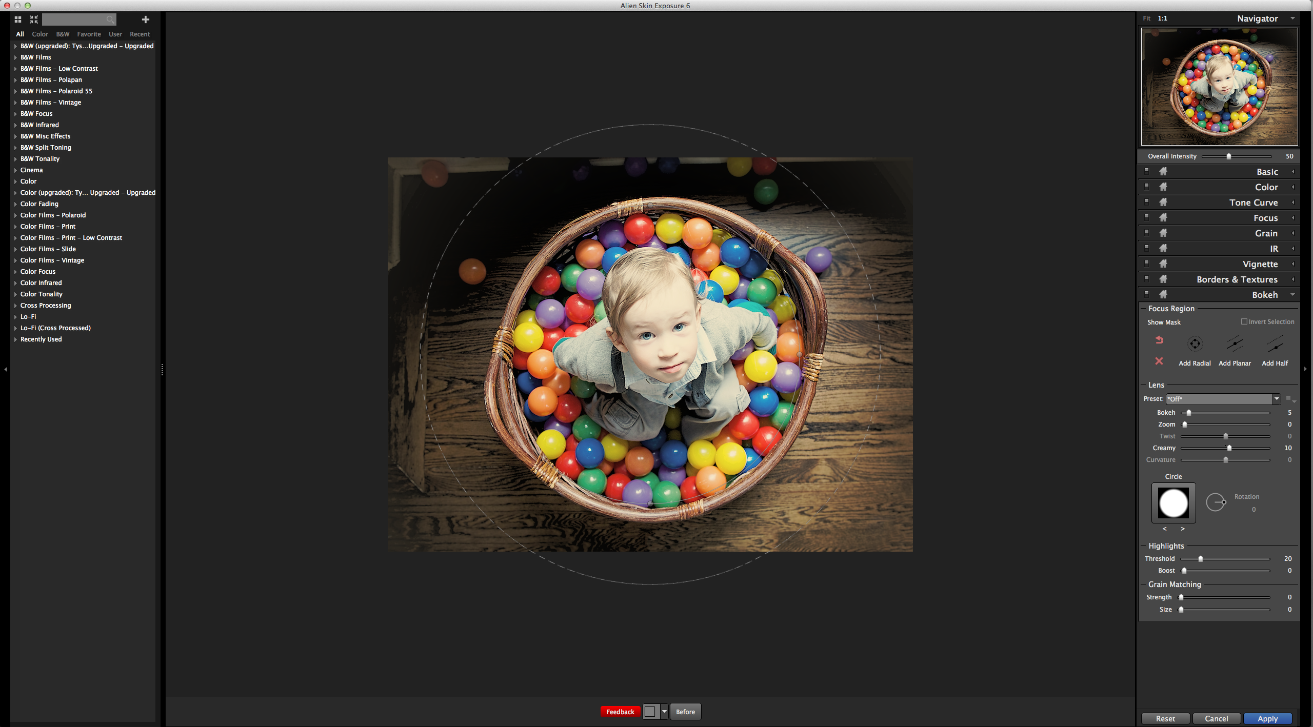 If you’ve used Bokeh in the past, you’ll know how cool it is. You can apply out of focus rendering from a variety of famous, bokeh producing lenses, or modify your own. You can apply this rendering to a selection or, as shown above, use the handy radial or planar region masks to quickly apply the blur to areas outside of your protected region. Regardless of how often the Bokeh portion is used, the fact that it now comes built in is pretty killer. What used to necessitate purchasing two plugins, now requires only one. I’ve found Exposure 6 to be, by far, the best version of Exposure that Alien Skin has produced. Kudos guys.