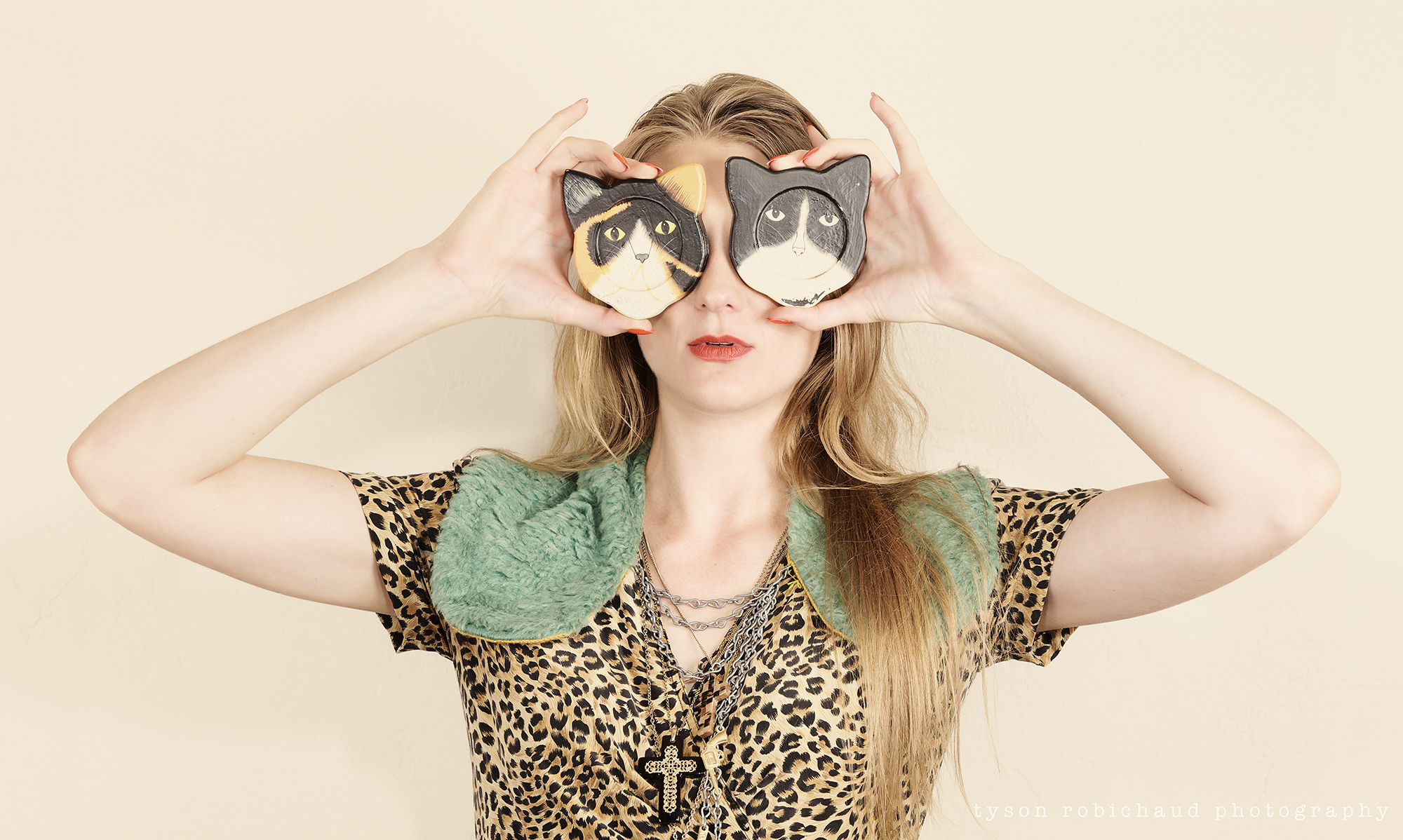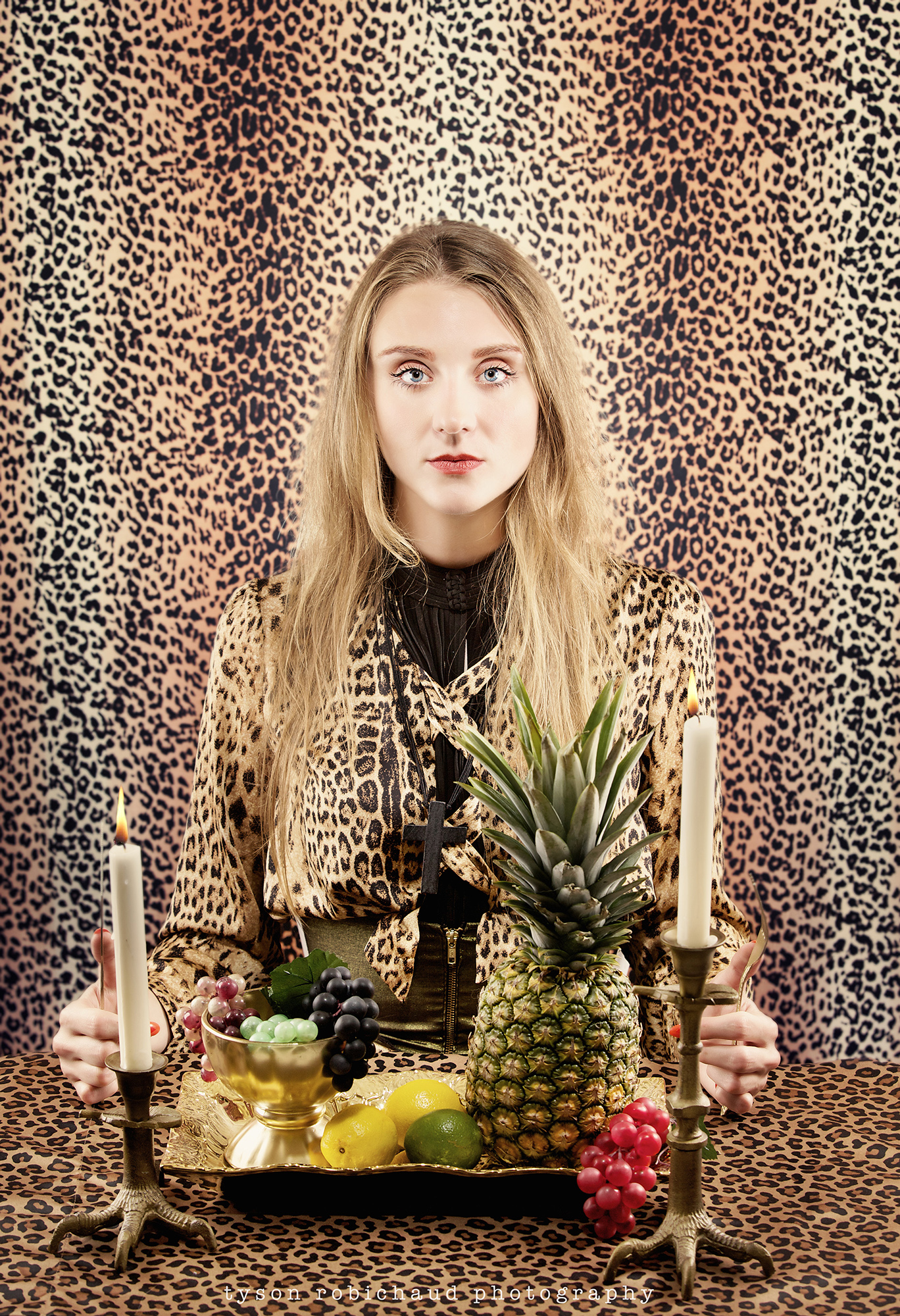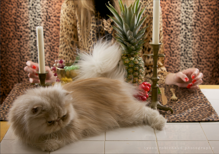 Our setups were straight forward. For one, while seated at the table, we had four lights, a couple cats, fake food and a whole lotta leopard print. The other, with Rebecca against the wall, we basically removed the background light and kept the ratios the same with sidelight and a key light above the camera and on axis. It is a pretty flat lighting setup which was a bit of a gamble, but the goal was to have the elements that were not leopard print, provide the contrast and visual intrigue after your eyes recover from the bombardment of the leopard.