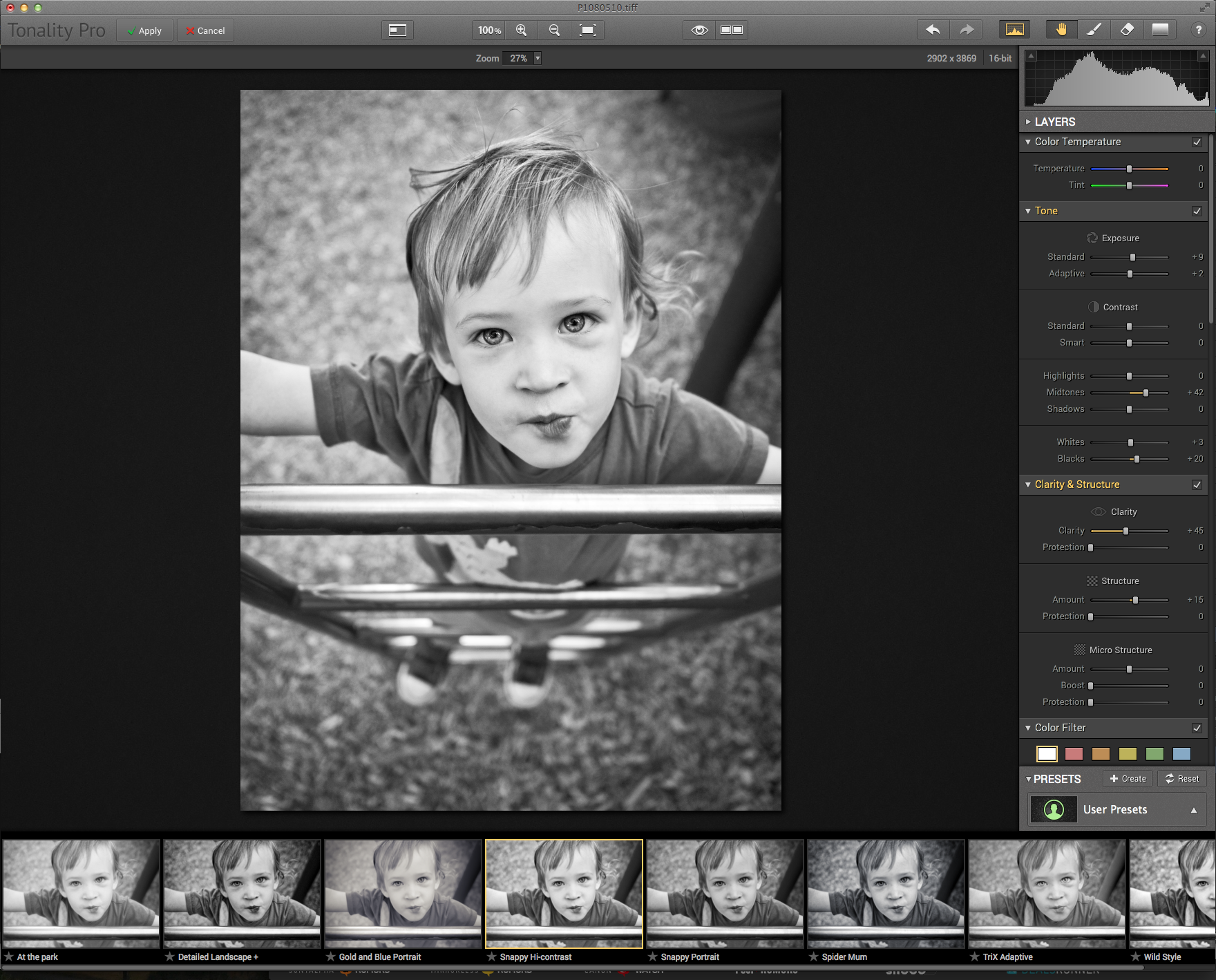 When opening an image in Tonality Pro, you are greeted with the default conversion, all sliders in their neutral position. The first instinct is to start clicking on presets to see how it suits your image (at least that is my first instinct). Broad strokes at first to see what you might be able to do with a single click as it were. Then, the power of this program sets in.