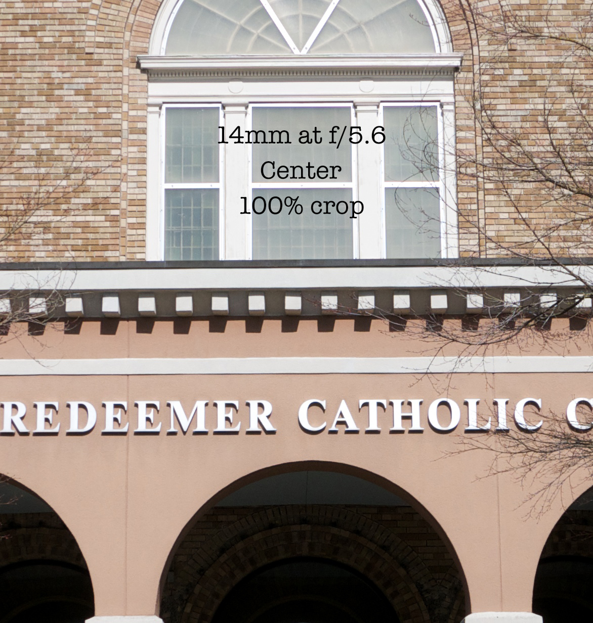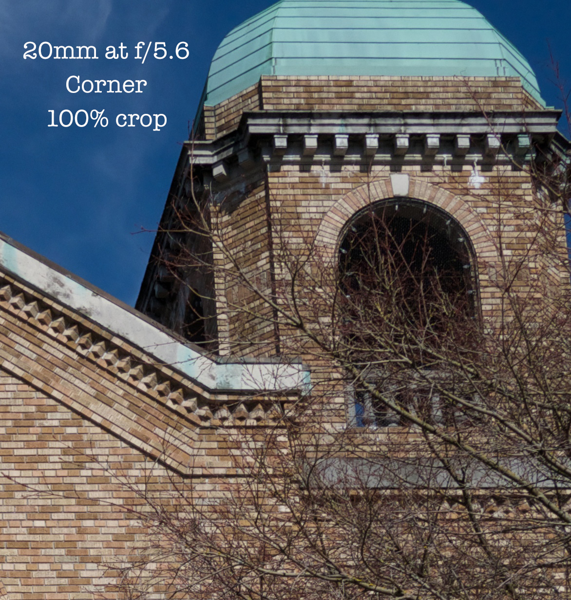 Well, to my eye, having been looking at these crops and even magnifying it to 200%, there is little difference in the center, either wide open or stopped down.  The 14mm does show a bit more CA wide open in this particular shot (more later, down below in the CA test), but that disappears when stopped down.  The 15mm has better contrast and through that appears sharper, albeit very slightly.  In the corners, the 15mm pulls away from the 14mm pretty easily both wide open at while not quite as noticeably, at f/5.6 too.  The 20mm fares better than the 14mm in the corners as well, looking comparable to the 15mm to my eye.