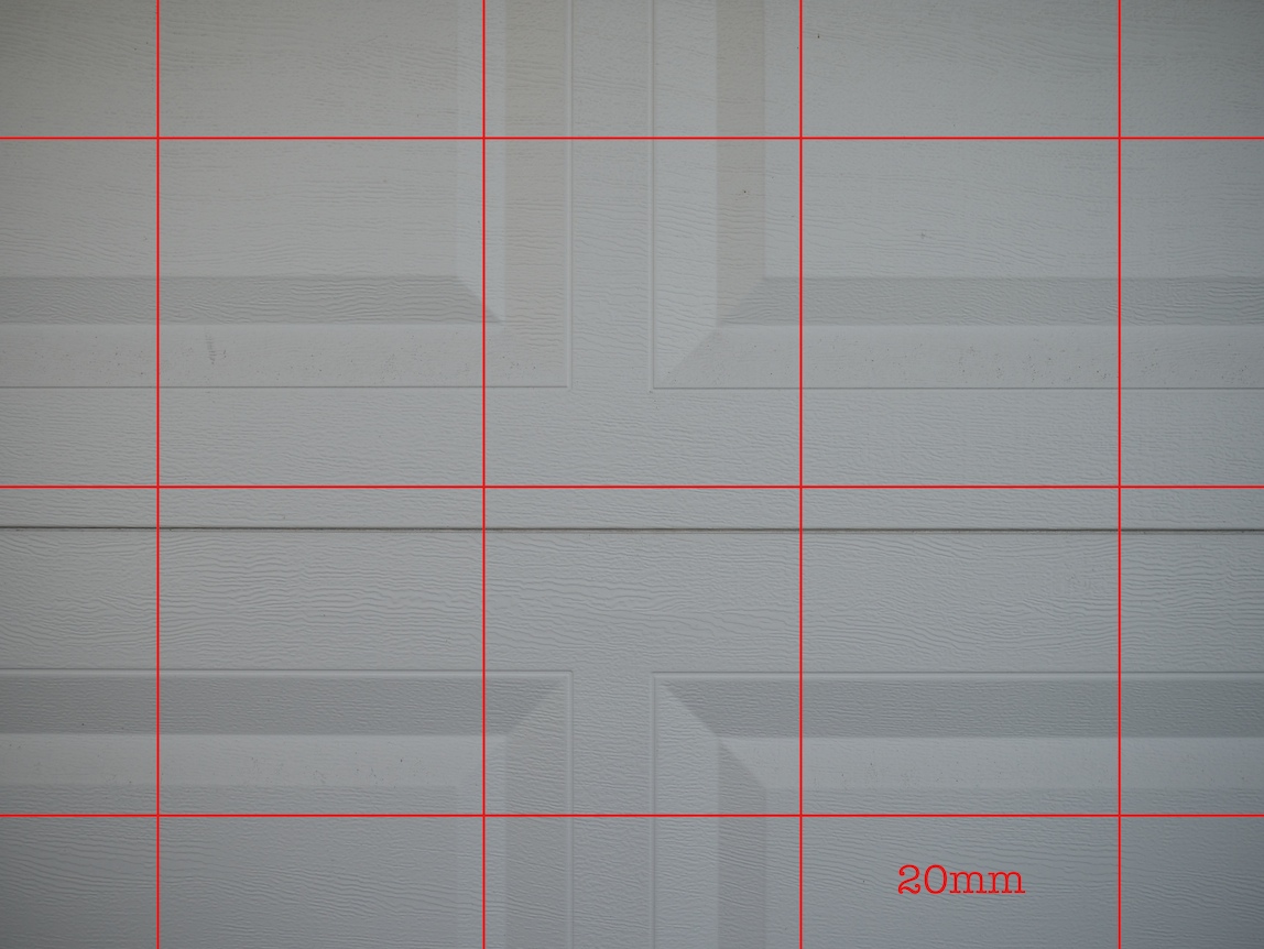 Here are shots from each lens from a fixed, leveled and squared location to compare distortion between the three.  The surface that I shot was also checked via a 4′ flat edged level to make sure it was on a flat plane, which it was.  I’ve overlaid a grid to visually aid us here.  Again, shot in RAW, and converted as noted above.