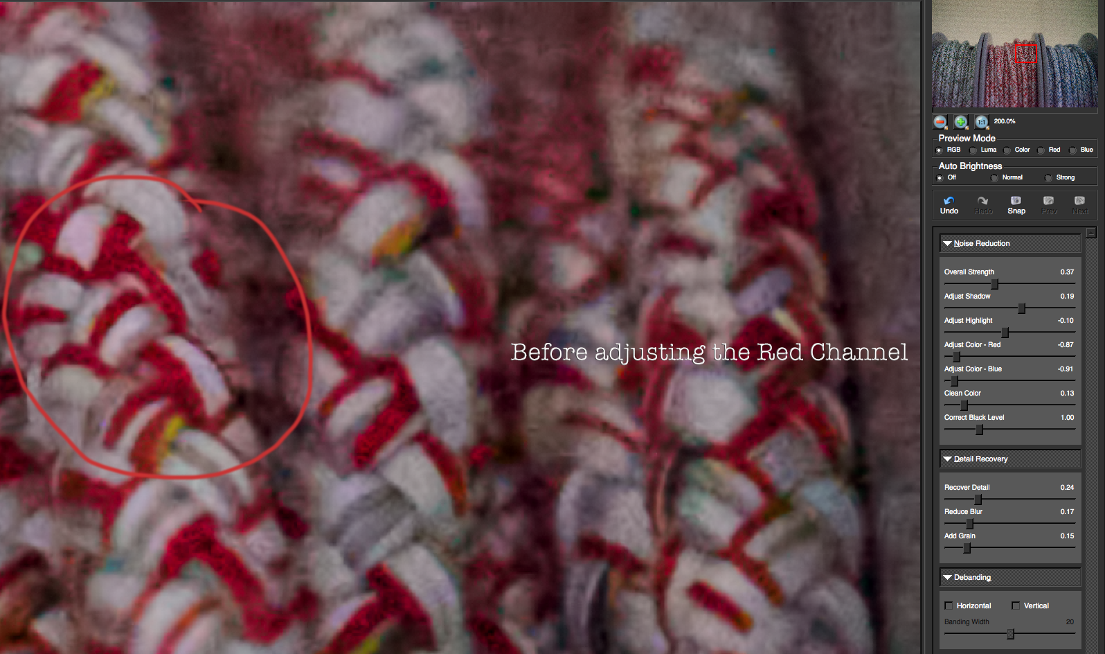 This is a shot taken at ISO 25,600, and with one click and a quick adjustment to the red channel and detail recovery sliders, I ended up with the resulting, “after” image. The retention, and actual definition of detail is pretty cool with this plugin, as is the recovery of the independent color channels. This is noticeable in the 100% crops, and even more so below in the screen shots with 200% magnification showing how adjusting the Red Channel slider can help bring back the reds, and remove the ugly mottling after the noise reduction is applied.