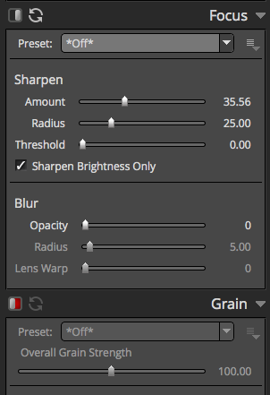 2 – To add a little pop, I’ve adjusted the Sharpen slider to around 35. I’ve also turned OFF the grain, so as not to sharpen any extra, added grain in the image, yet. I save the image, which brings me back into PS with this new filter as its own layer.
