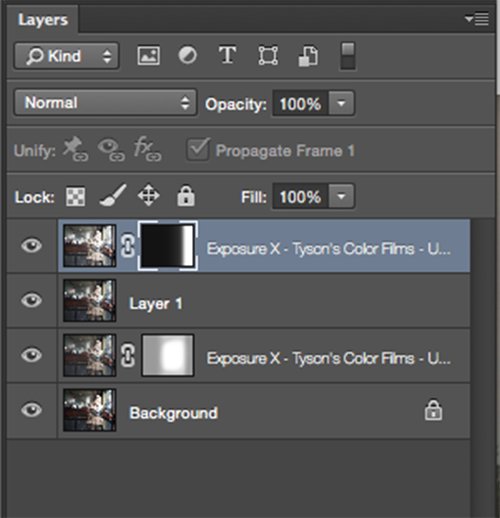 4 – Using SHIFT + ALT/OPT + COMMAND +E, I merge onto a singular layer above our background and Exposure layer. I then re-open this new layer in Exposure, once again.