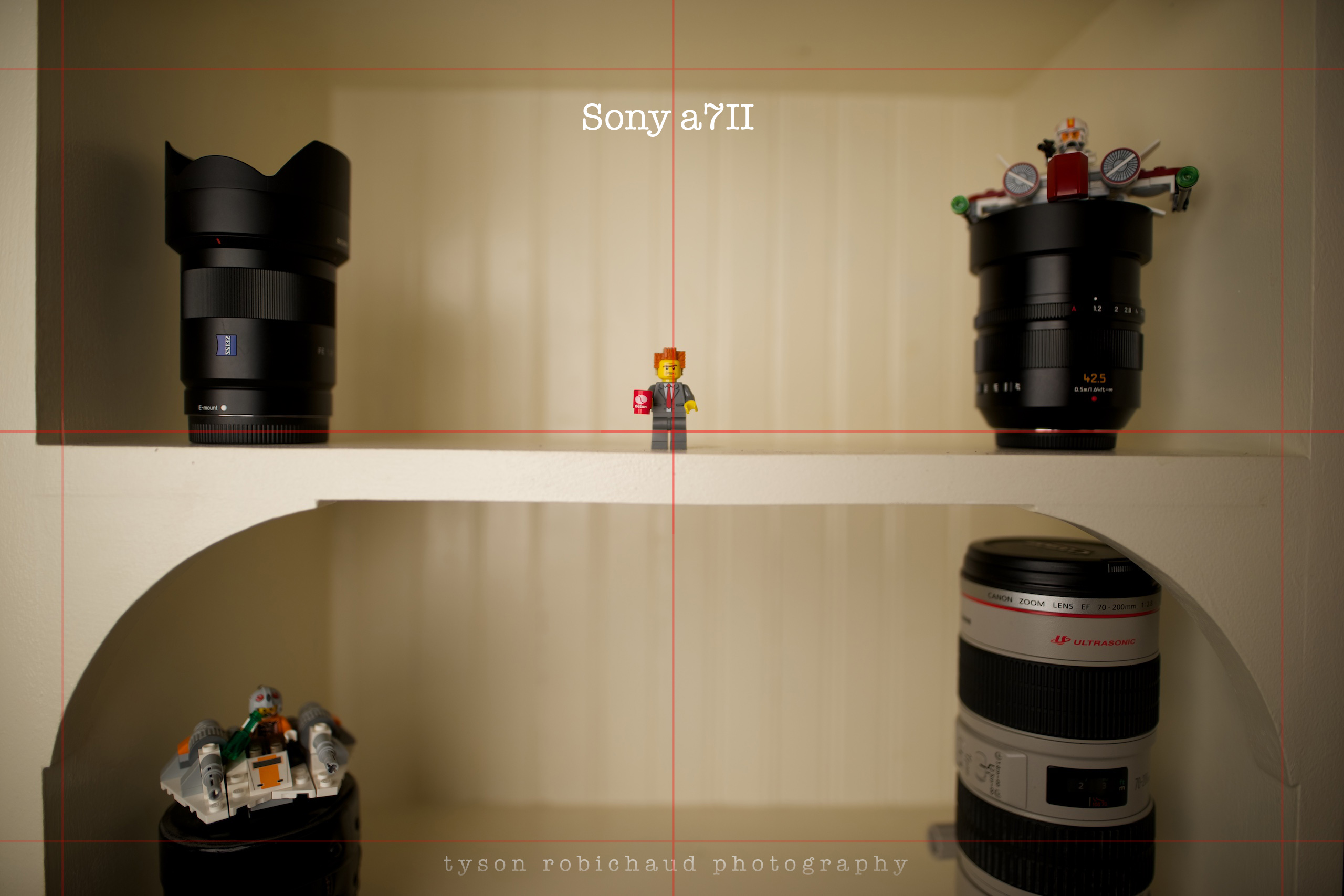 Below I’ve got comparison shots between this lens on the Sony a7II, and the Canon 5DII with the full image files from each first with a squared line overlay, followed by 100% crops from the center (at the point of focus) and the bottom right corner to see how this lens does at near minimum focusing distance with sharpness, distortion and vignetting. All pieces on the shelves were placed an equal distance from the edge of said shelves, and while the lens and cameras were centered, the further away from the center of the image, the further away from that point of focus due to field curvature. The point of focus is the teeny red cup, held by Mr. Business, center frame. At this close a focus distance (~18″), distortion and softness are certainly exaggerated, but this is about as bad as I can get this lens to perform, so there’s that. If I were doing any personal shooting this close to anything, I’d not be too worried about the corners, myself. More than the ultimate sharpness in the corners though, have a look at the vignetting as seen in the corner crops below.
