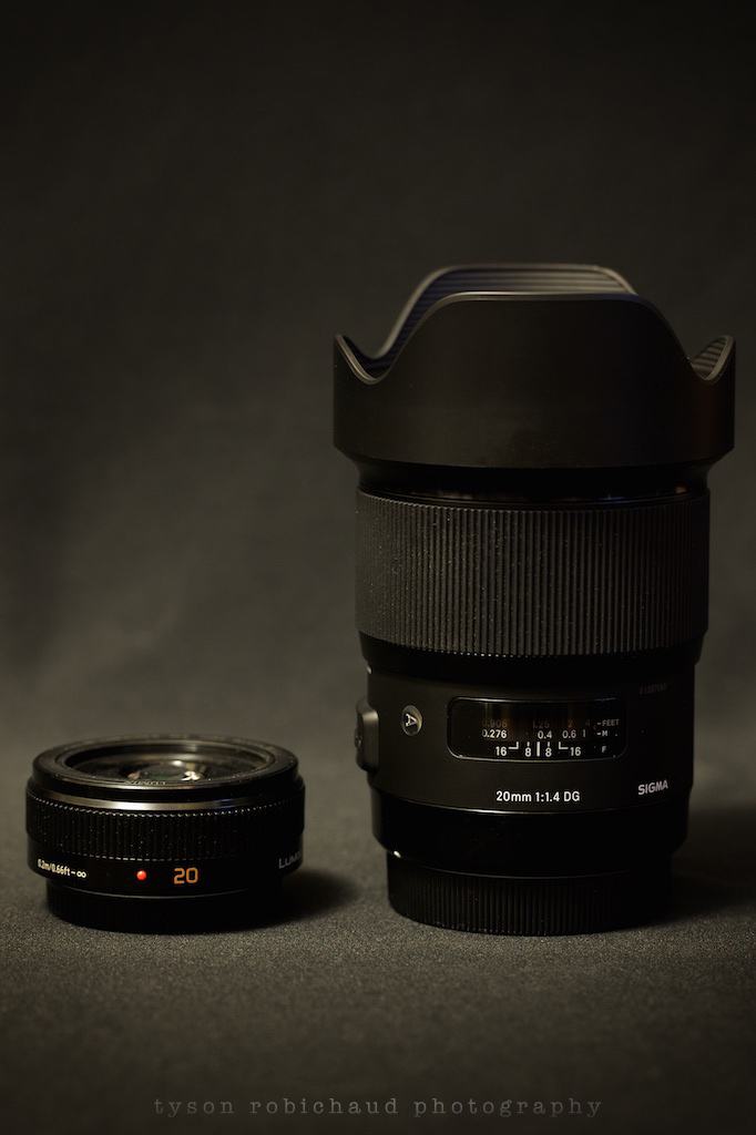 Granted, one is designed for use on a sensor 1/4 the size of the other, but before you start talking about “fast lenses” requiring a lot more glass just purely based on the physics, the micro 4/3 lens max aperture of f/1.7, still measures in only about 2mm smaller than the max aperture of the Sigma f/1.4 for reference. Yes, the m4/3 Lumix lens crops to a 40mm equivalent field of view, but a 20mm lens is a 20mm lens as far as math is concerned with the optics needing to properly focus light at a distance of 20mm from the capture medium to the rear nodal point at infinity. Here in lies perhaps some insight into the lengths Sigma has gone in designing and building this optic, and while both of these 20mm lenses are optical achievements in design and performance, a full frame optic will always have a harder time getting light spread across a larger surface area while properly focused.