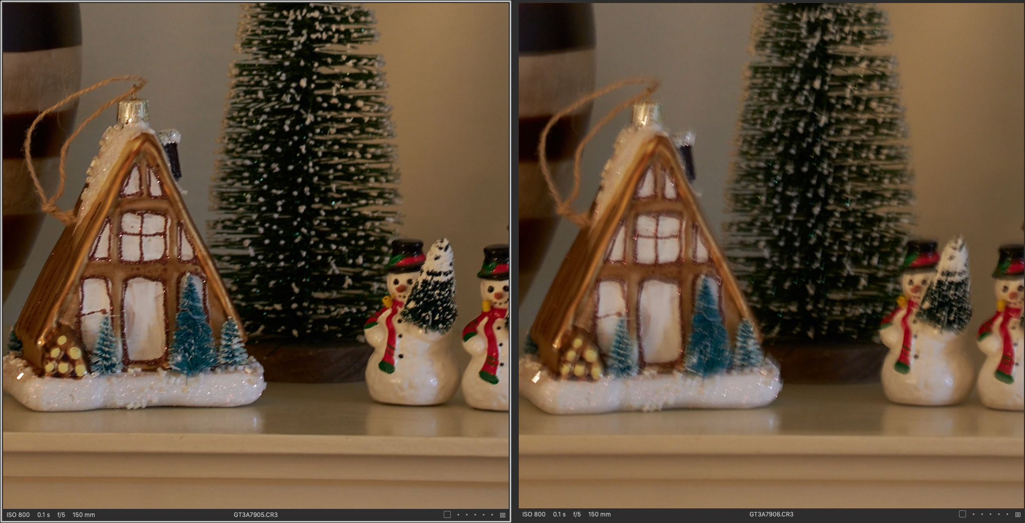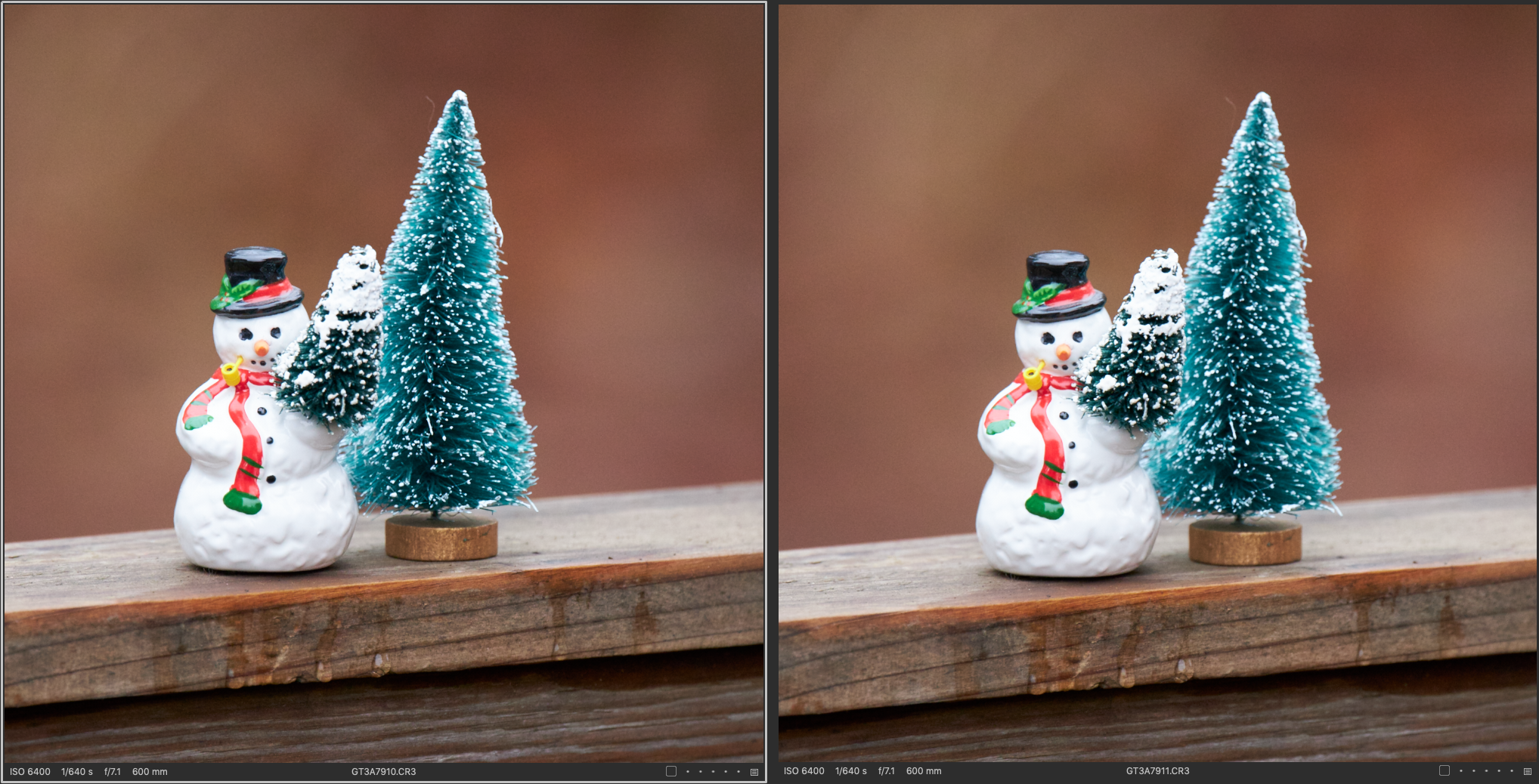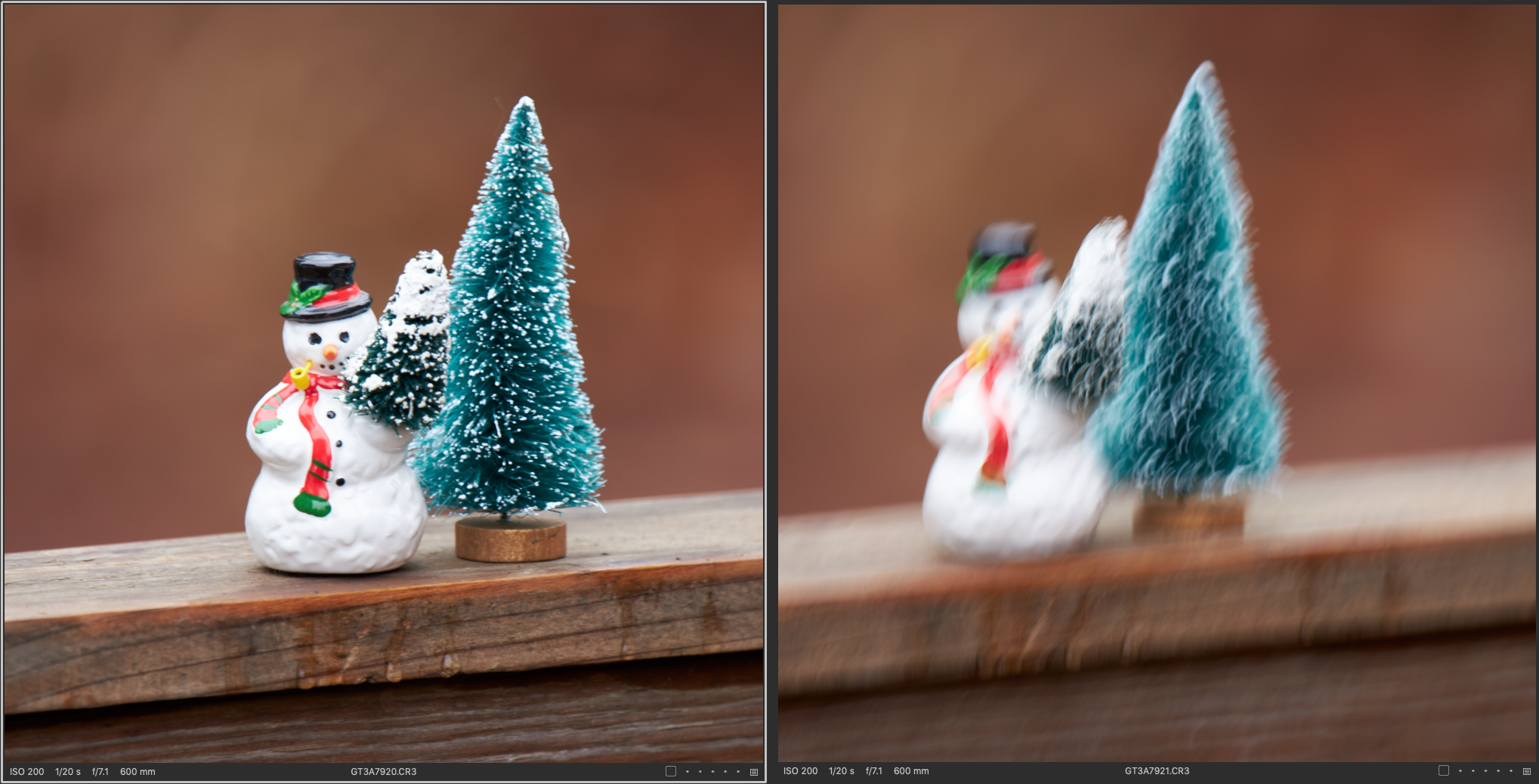 Now, looking at the 600mm shots, I felt I was able to squeak another stop out via the OS. Why? I’m not sure. Perhaps my technique tends to jive with longer focal lengths for some reason, or maybe the OS is optimized for the longer end of the range most likely, but regardless, 4 to 5 stops of stabilization for a 600mm lens being able to shoot down into the neighborhood of 1/20th of a second is kinda nuts. Would I rely on this? No. Knowing this lens seems to be able to pull this off though, is a great little nugget to have in the arsenal. One other thing to notice, or one that I noticed, was how much more the frame moved without the OS. I focused each frame on the snowman’s face, which stays mostly center frame in the OS aided shots, but moves around quite a bit in the non OS shots showing just how much little movements at the camera’s position can affect your framing, and subsequent sharpness at these extreme focal lengths.